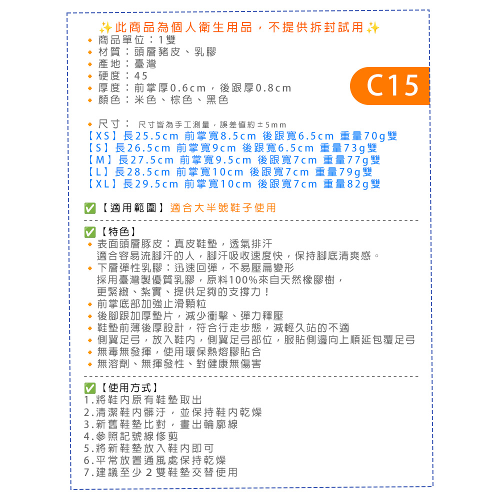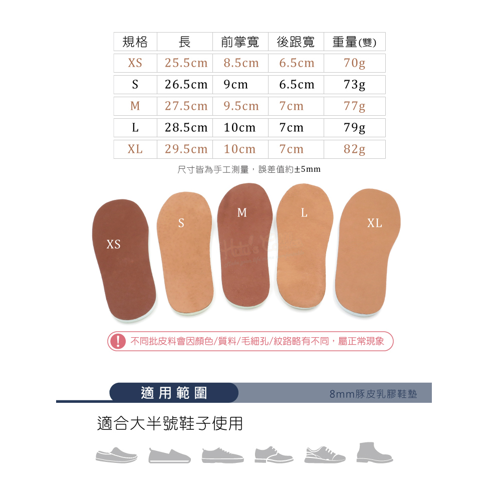 鞋鞋俱樂部 8mm豚皮乳膠鞋墊 真皮鞋墊 1雙 906-C15 米/棕/黑 XS/S/M/L/XL