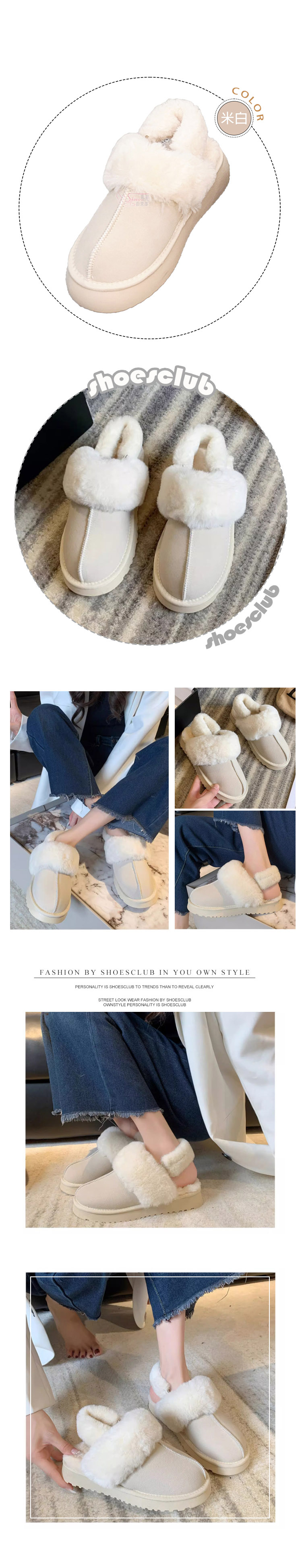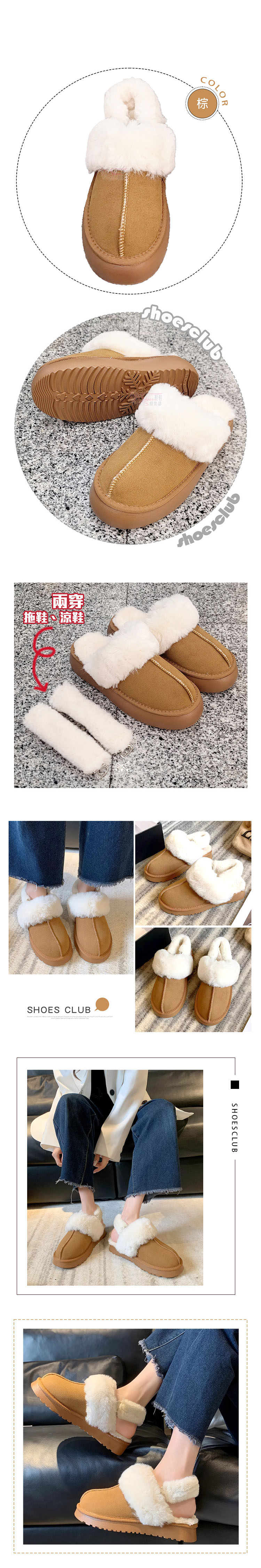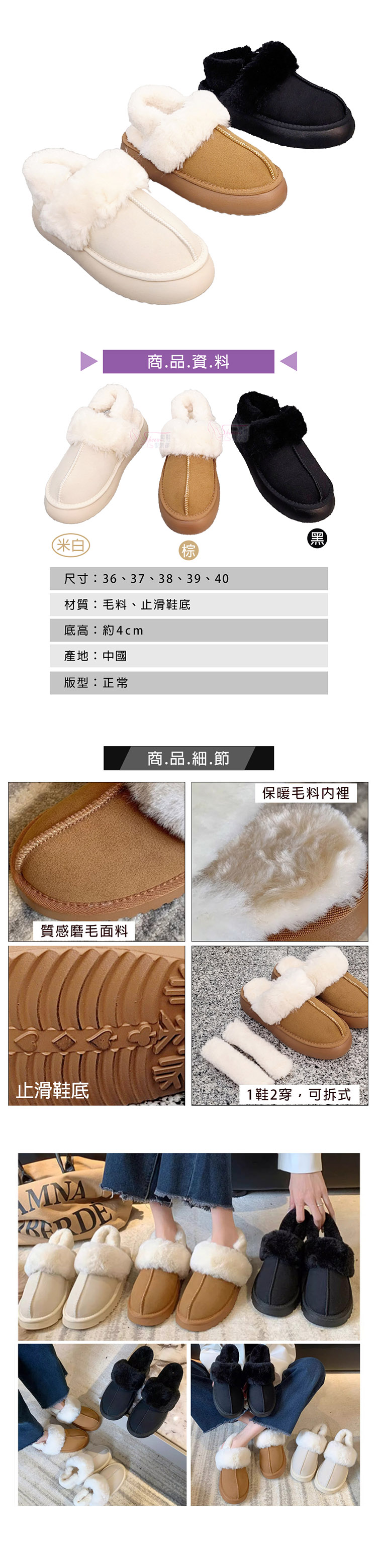 材質:PU合成皮、合成橡膠鞋底、鋪毛板、人造毛料