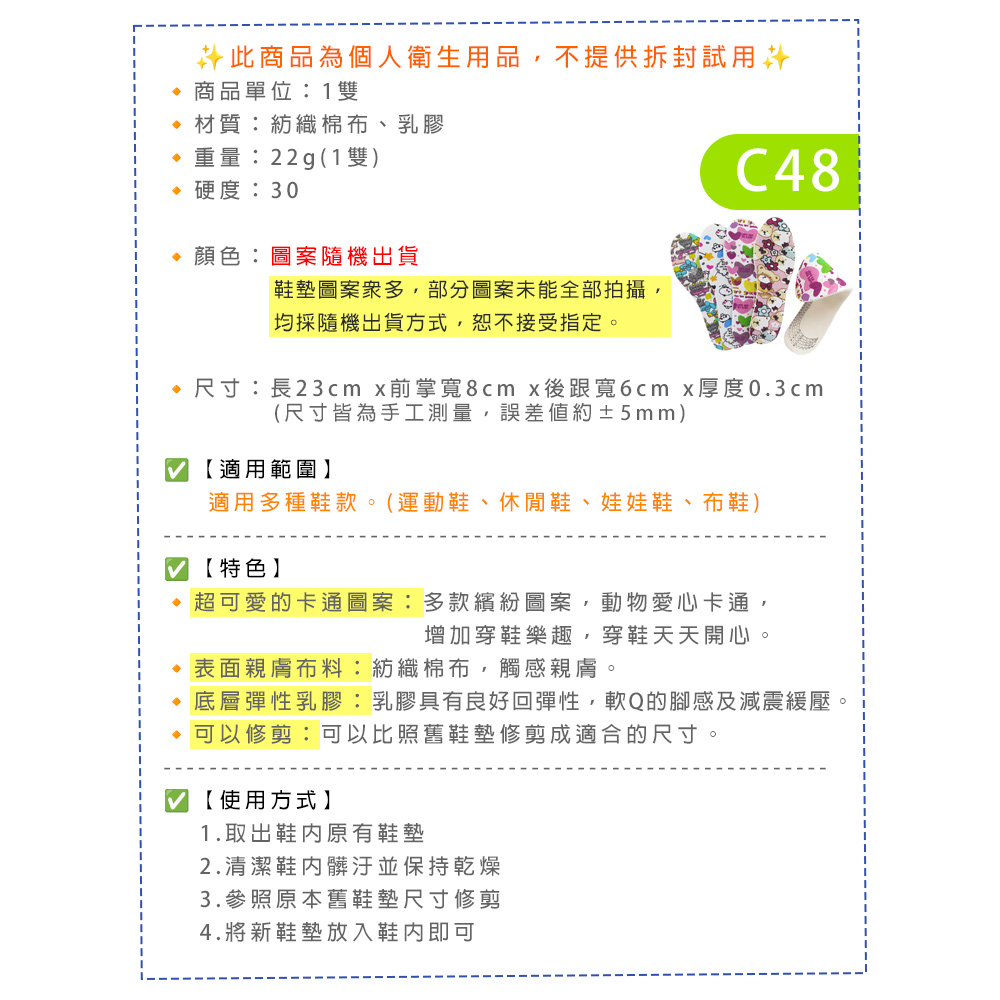 (鞋墊圖案眾多,部分圖案未能全部拍攝,均採隨機出貨方式,恕不接受指定)