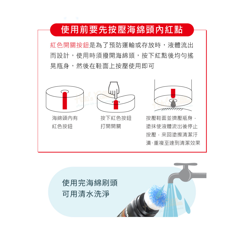 本產品蓋子打開即是海綿刷頭,直接在髒污處加壓讓清潔劑流出後來回刷洗髒污,